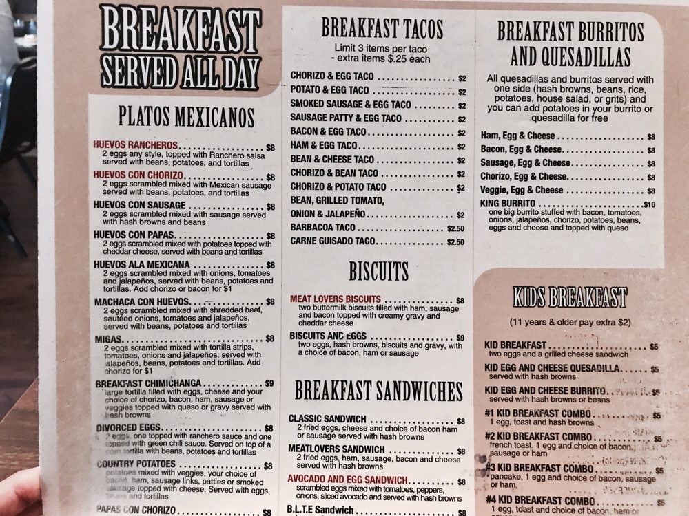 Two eggs cooked any style, served with hash browns, your choice of meat (ham, sausage link, sausage patty, bacon, or sausage), and sopapillas sprinkled with powdered sugar and caramel.